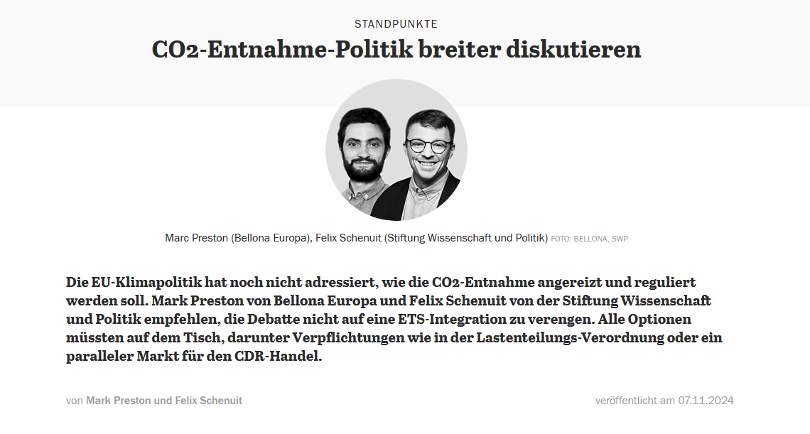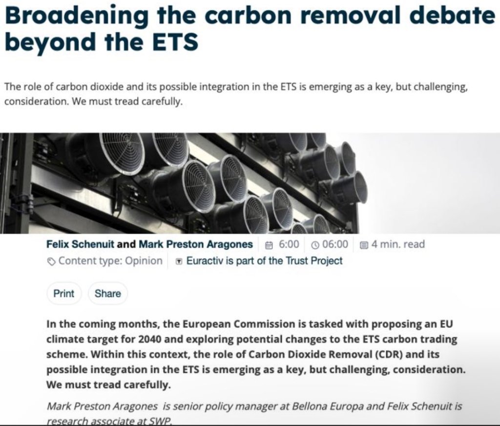 In the coming months, the European Commission is tasked with proposing an EU climate target for 2040 and exploring potential changes to the ETS carbon trading scheme. Within this context, the role of Carbon Dioxide Removal (CDR) and its possible integration in the ETS is emerging as a key, but challenging, consideration. We must tread carefully. Joint op-ed with Mark Preston in Euractiv (English) and Tagesspiegel Background (German).